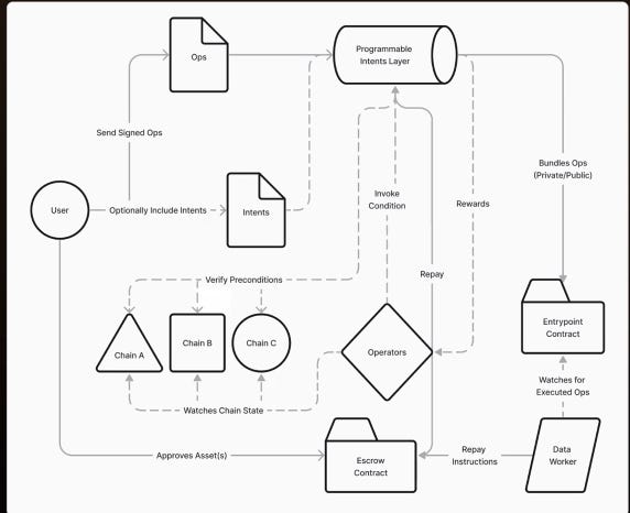 Some teams are building layers that power these protocols — Light, for example, can sit a layer below other cross-chain interoperability protocols (including potentially Across, UniswapX, …) and acts as middleware that powers chain abstraction that users interact with. Interestingly, Light supports any configuration — conditional, DCA, intent graphs, etc — across multiple chains expressive within the EVM, while most intent-based protocols only support limit orders, at least to start. In addition, Light uses an orderflow auction where users can programmatically define conditions, security, and settlement of cross-chain transactions which helps to ensure the best execution.